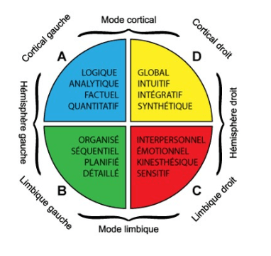 Le modèle Herrmann par exemple, offre un moyen efficace de comprendre les préférences cérébrales d’une personne en termes de modes de pensée et de prise de décision. Il classe les perceptions des individus en quatre quadrants, chacun représentant une préférence de pensée différente