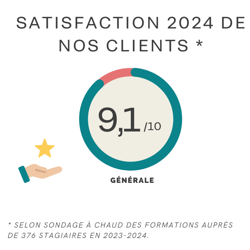 Nous avons à cœur d’offrir des formations de qualité, adaptées aux besoins spécifiques de chaque participant. Merci à tous les participants de nous accompagner dans notre processus d’amélioration continue.